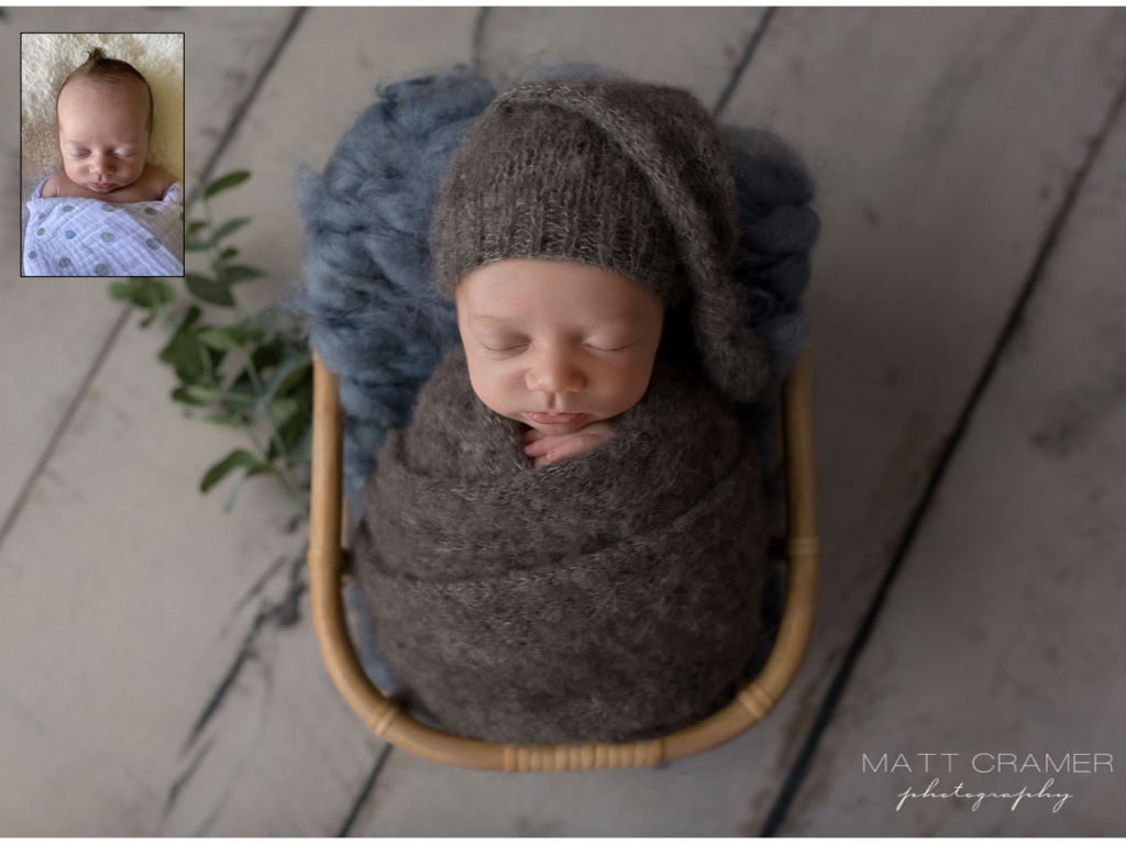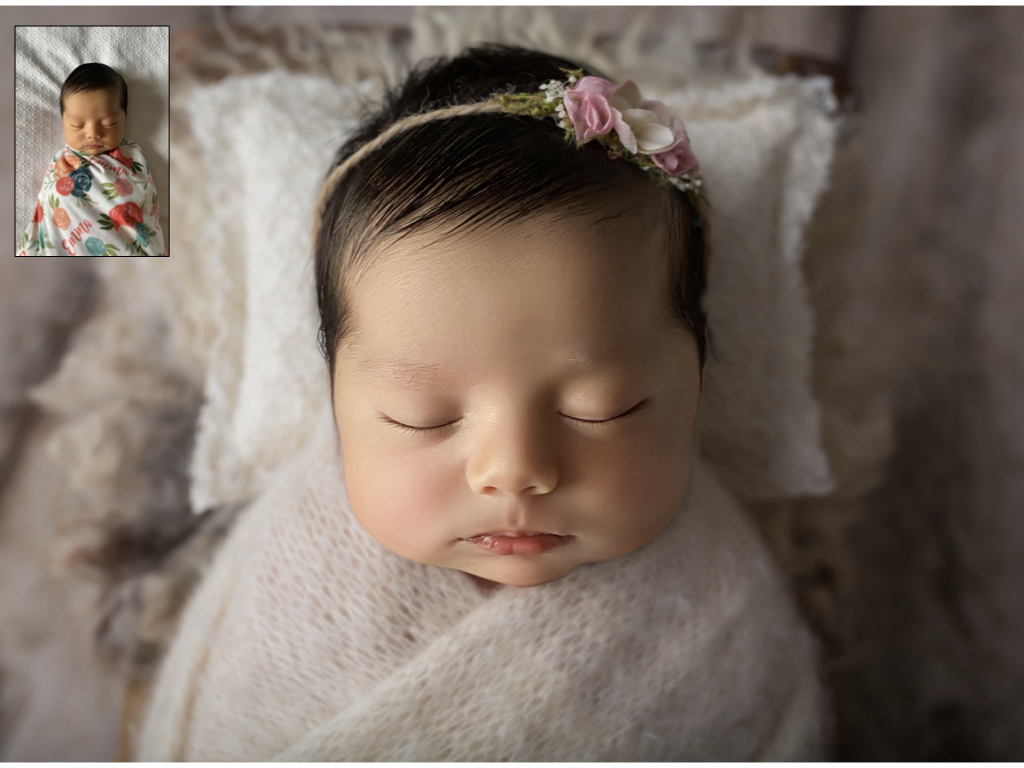This is where the face swap comes in. We can take another photo where they are looking at the camera or haven’t blinked and replace it using Photoshop, so our final result is one photo where everyone looks great. I started to think about how we could use this idea for a newborn photo.