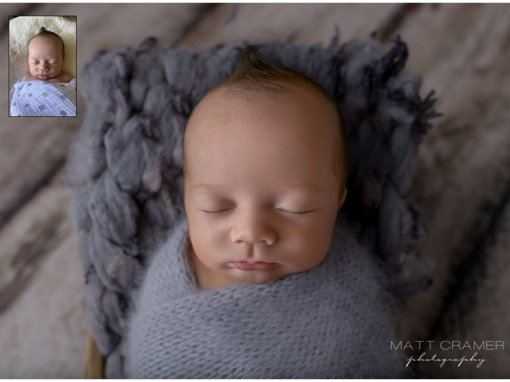 What if the newborn was looking off camera or blinked, could we theoretically replace it with another face? If the lighting was right and the angle was easy enough, the answer was yes. Now we were getting somewhere. If we could help parents find the best natural light in their home and take a simple and straightforward photo of baby, without any kind of tricky or unsafe posing, we could then take this photo into Photoshop and face swap it into our existing portfolio images with a similar facial angle.