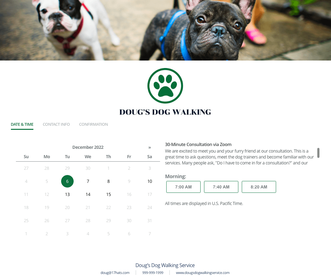 Offboarding a client is a critical part of the client process. When you schedule a meeting after your service has concluded, you will collect crucial feedback, can ask for a review, and increase the likelihood of future referrals. Use a header image with a celebratory feel to book these meetings through Online Scheduling. Perhaps you are a realtor – show a house with a sold sign. Or maybe you are a dog trainer – a cute photo of a dog performing a skill would be fantastic. Think of the problem your service solves and use Online Scheduling and offboarding meetings to drive that solution home.